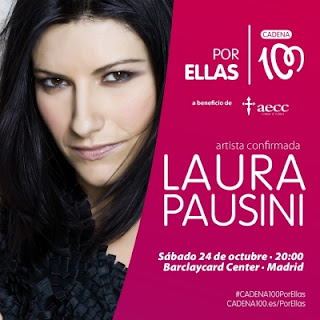 A nossa cantora vai estar presente em mais um evento de beneficência: no próximo dia 24 de Outubro, um sábado, Laura irá actuar no evento "Cadena 100 por Ellas", no Barclaycard Center, em Madrid, Espanha. A nossa diva é a 1ª artista confirmada na 3ª edição deste espectáculo, que tem como base a luta contra o cancro da mama. Durante cerca de 3 horas, passarão pelo palco alguns grandes nomes da indústria músical. O evento tem início marcado para as 20.00.